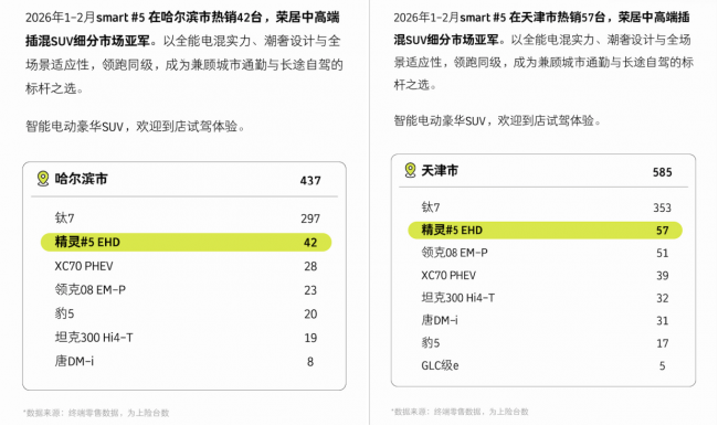 从市场表现来看,东北这样的极端用车环境,一直被视为新能源的“终极考场”。低温、长途、复杂路况,每一项都是硬考验。但smart精灵5号却在哈尔滨稳居中高端插混SUV销量TOP2,用户用真金白银投票,这种认可,比任何参数都更有说服力。同样的情况也出现在天津,双城同步热销,说明这不是偶然,而是产品力被验证后的结果。